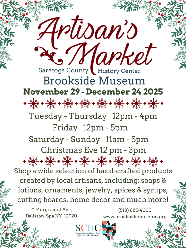 The Saratoga County History Center at Brookside Museum is celebrating the 25th year of our annual Artisan’s Market, which will be open between November 29 and December 24, 2025.