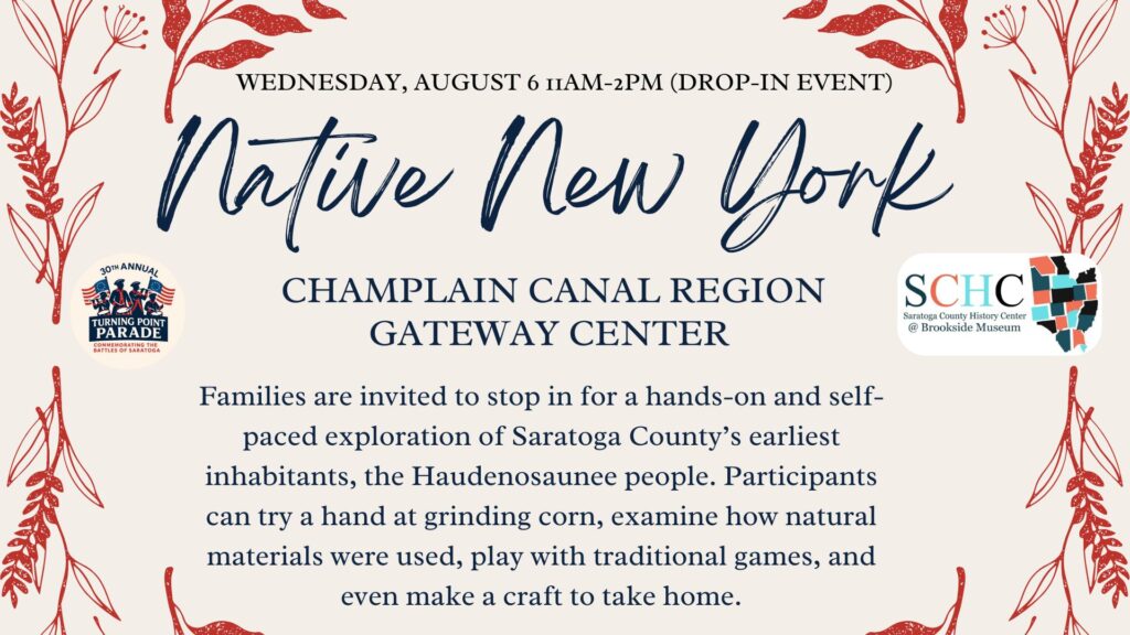 Our Education Department is excited to be joining the Turning Point festival this year at the Champlain Canal Region Gateway Visitors Center for Native New York. Families are invited to stop in for a hands-on and self-paced exploration of Saratoga County’s earliest inhabitants, the Haudenosaunee people. Participants can try a hand at grinding corn, examine how natural materials were used, play with traditional games, and event make a craft to take home.