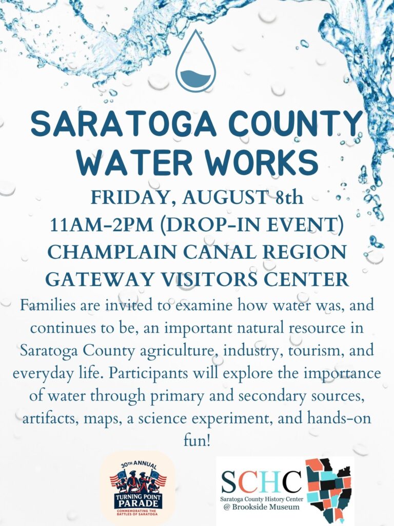 Our Education Department is excited to be joining the Turning Point festival this year at the Champlain Canal Region Gateway Visitors Center for Saratoga County Water Works. Families are invited to examine how water was, and continues to be an important natural resource in Saratoga County agriculture, industry, tourism, and everyday life. Participants will explore the importance of water through primary and secondary sources, artifacts, maps, a science experiment, and hands-on fun!