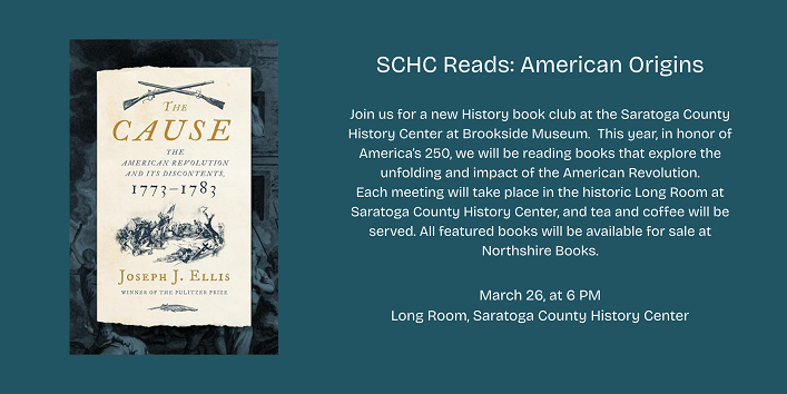 Join us for a new History book club at the Saratoga County History Center at Brookside Museum.This year, in honor of America’s 250th, we will be reading books that explore the unfolding and impact of the American Revolution.